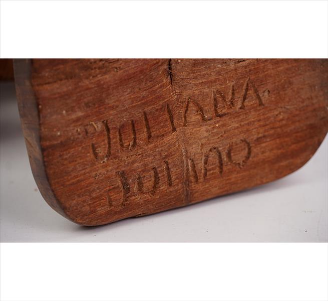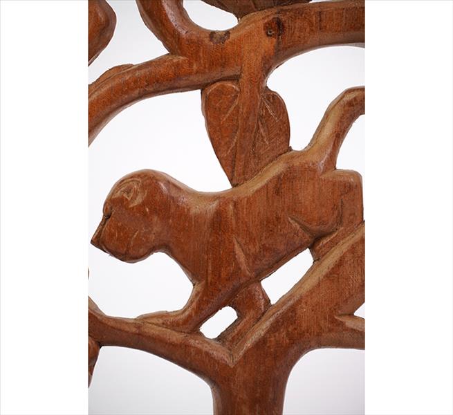 JULIANA JULIÃO, Grupo escultórico de madeira entalhada, representando árvore e macacos, assinada sob a base. Alt. 38 x 21 x 10cm.