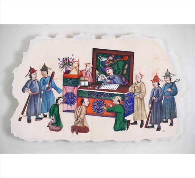 Fragmento de pintura oriental sobre tecido, representando figuras em cena de tribunal, montado sobre fina moldura de acrílico. 43 x 53 x 03cm.