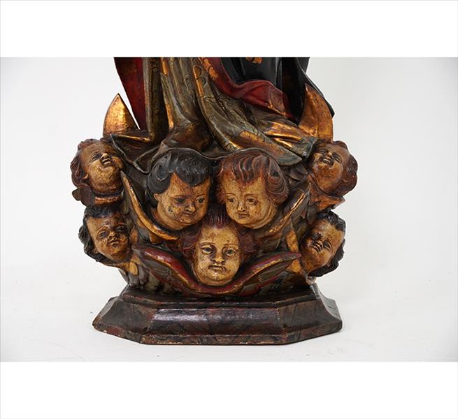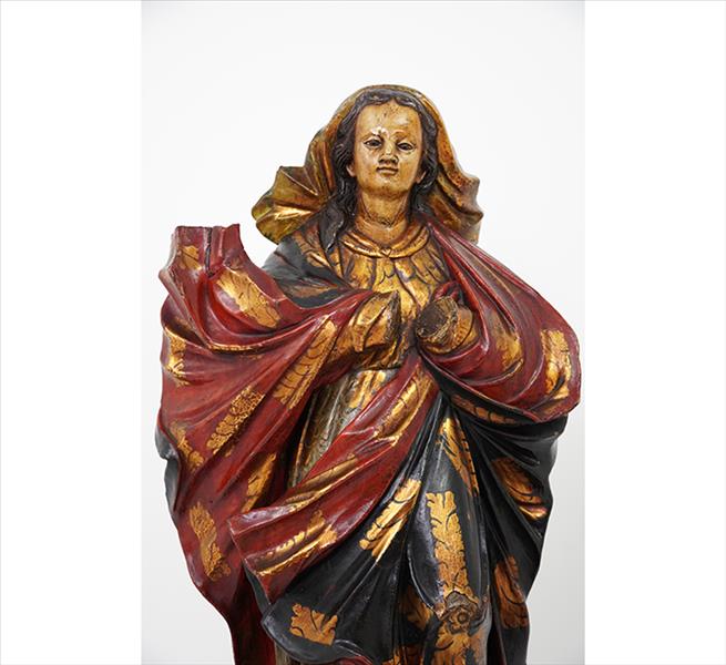 NOSSA SENHORA DA CONCEIÇÃO, Imagem sacra de madeira entalhada, policromada e dourada e com olhos de vidro . Alt. 91 x 39 x 27cm (total com base). Brasil séc. XIX