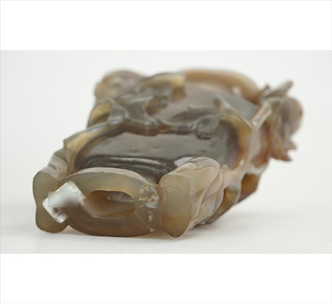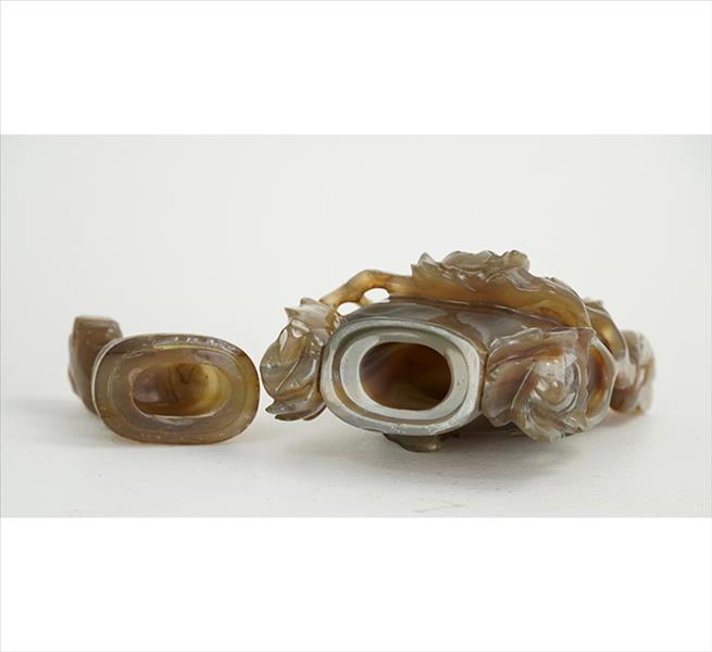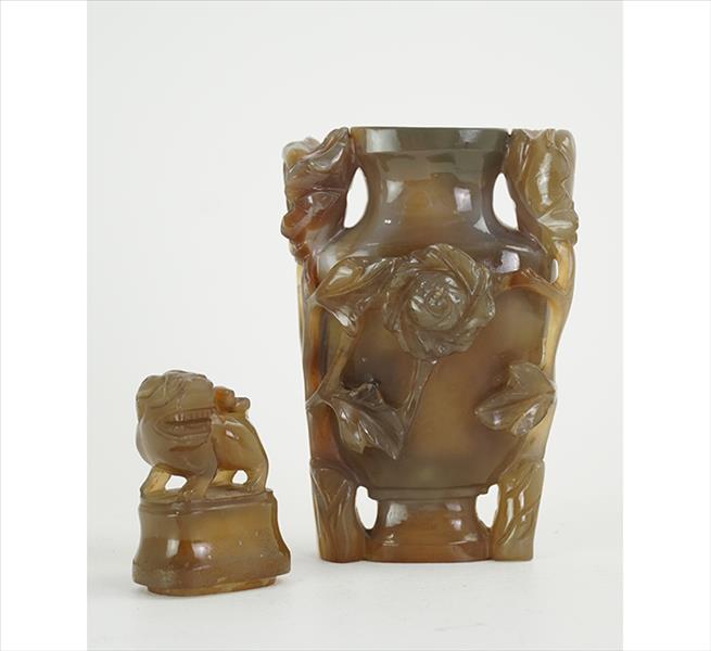 Ânfora de pedra ágata esculpida, decorada com motivos florais e pega da tampa em forma de cão de Fó. Alt. 22 x 8 x 4cm. China, séc. XIX (com pequenos bicados)