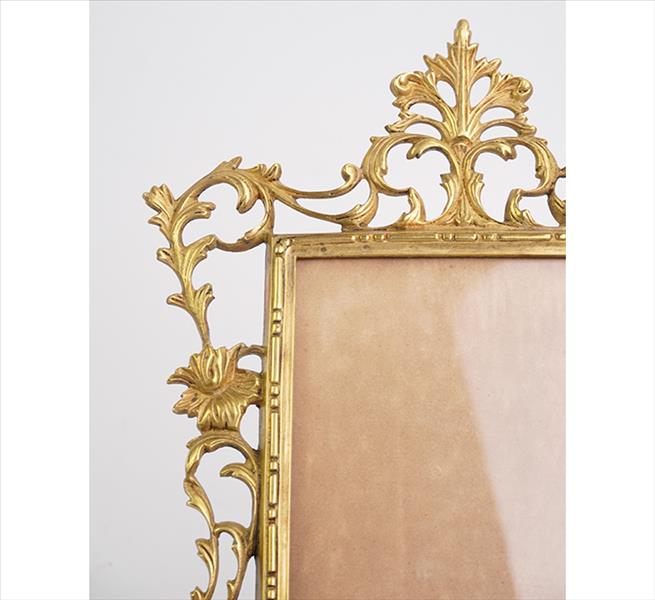 Porta-retratos de bronze dourado, ricamente decorado com volutas e ramagens. Alt. 37 x 28 x 20cm. Início séc. XX