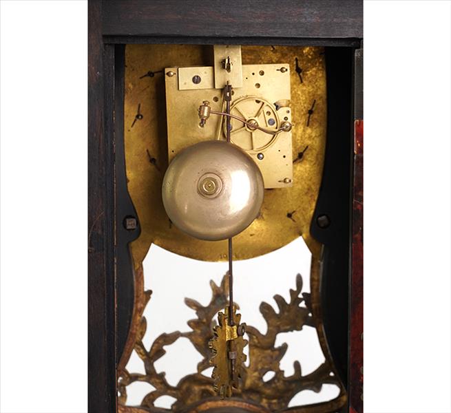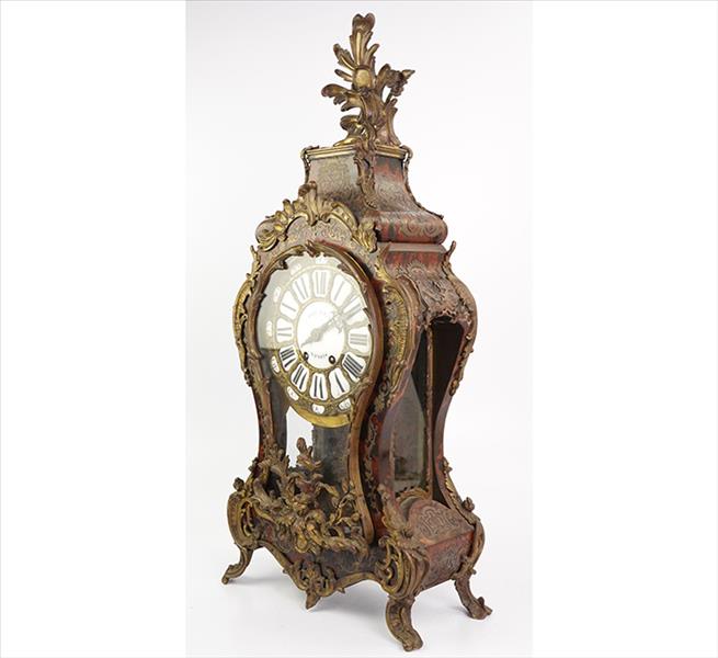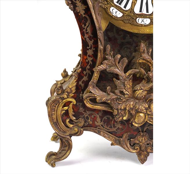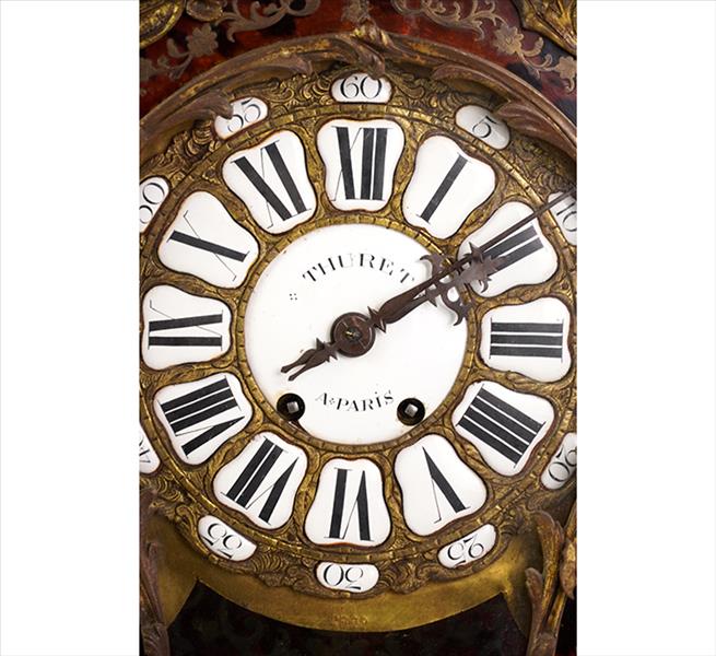 THURET PARIS, Relógio de mesa estilo Boulle, estrutura de madeira com marchetaria de casco de tartaruga e bronze, estilo Luis XIV, ricametne decorado com guirlandas e volutas, mostrador de porcelana esmaltado com inscrição Thuret A Paris. Alt. 76 x 34 x 16cm. França, séc. XIX (não testado / pode precisar de revisão / alguns detalhe soltando)