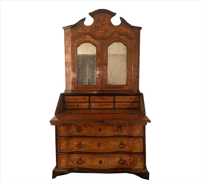 Móvel trumeau dito bookcase, estrutura em dois volumes de madeira nobre revestidos com folhas de rádica, parte inferior contendo 03 gavetas e tampa basculante, parte superior com portas espelhadas e nichos internas. Alt. 237 x 120 x 55cm (total). Europa, séc. XVIII. (com sinais de uso/manuseio, precisa pequenos restauros)