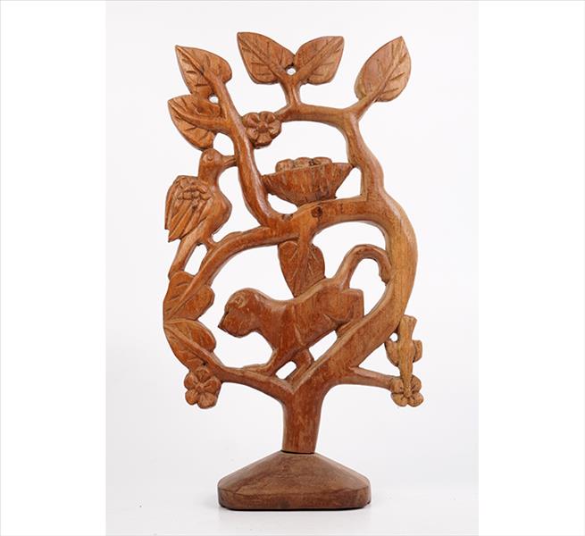 JULIANA JULIÃO, Grupo escultórico de madeira entalhada, representando árvore e macacos, assinada sob a base. Alt. 38 x 21 x 10cm.