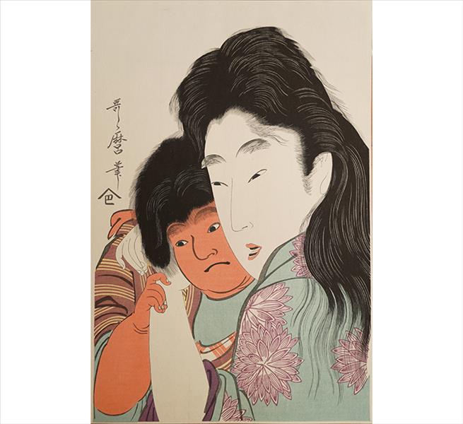 KITAGAWA UTAMARO, Yamauba e Kimtaro, Xilogravura Ukiyo-e, assinada. 38 x 25cm. Japão, séc. XX (sem moldura)