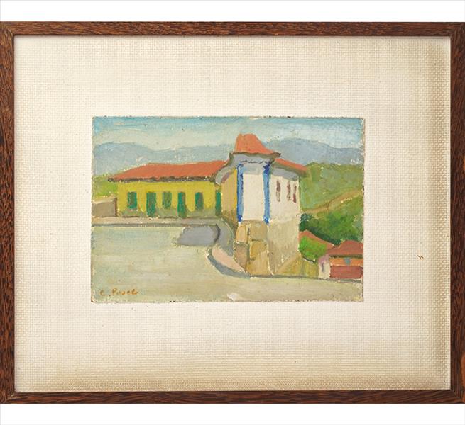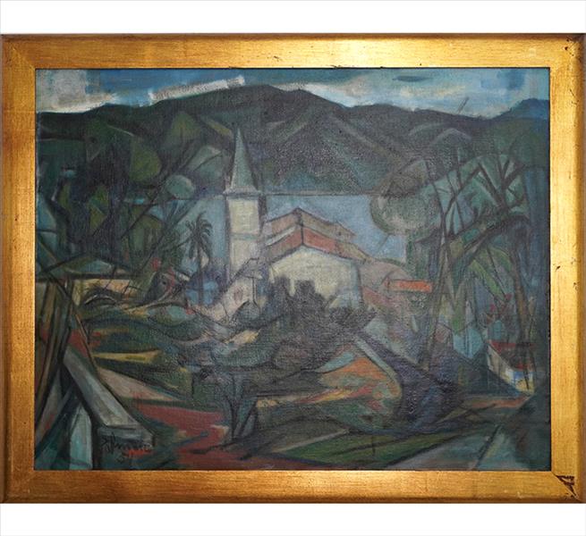 Quadro com assinatura de artista não-identificado, Paisagem com Igreja, OST, ACIE, 63 x 80cm (m.i). Datado 1954 (moldura com sinais de cupim)
